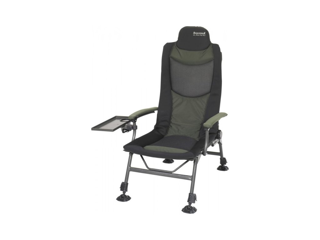Velké a pohodlné rybářské křeslo, které je silně polstrované a je vybaveno loketními opěrkami. Oblast hlavy a ledvin je polstrována extra silně. Má hliníkové, výškově nastavitelné nohy zakončené koncovkami proti zaboření. Křeslo je vyrobeno z600D polyesteru, který odpuzuje vodu a nečistoty. Součástí dodávky je i praktická odkládací plocha (stoleček) o rozměrech 18 x 40 cm, který lze přišroubovat na bok. Pohodlný sedák a extra vysoké opěradlo zaručuje naprostý komfort. Nosnost je 170kg.